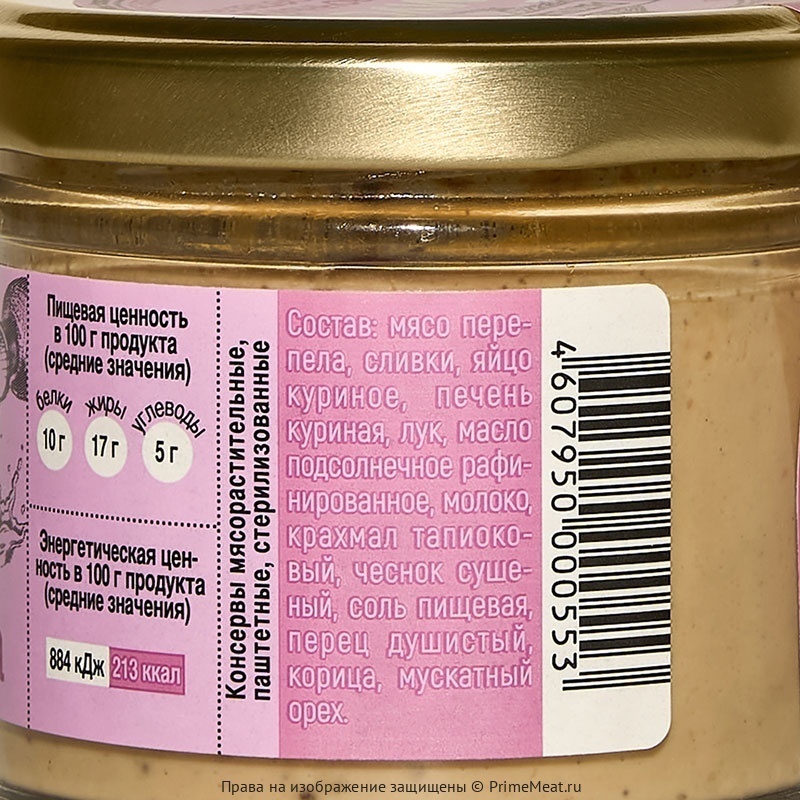 Состав: Мясо перепела, сливки,яйцо куриное,печень куриная,лук,масло подсолнечное рафинированое,молоко,крахмал тапиоковый,чеснок сушеный,соль пищевая,перец душистый,корица,мускатный орех