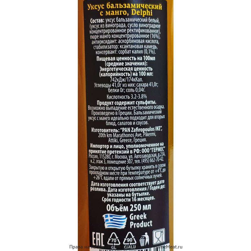 Состав: уксус бальзамический белый (уксус винограда, сусло виноградное концентрированное ректификованное), пюре манго концентрированное (16%), антиоксидант: аскорбиновая кислота, стабилизатор: ксантановая камедь, консервант: сорбат калия (0,1%). Срок годности 24 месяца с момента производства.