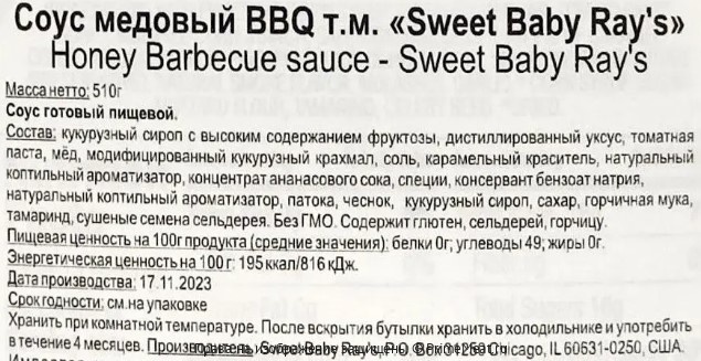 Состав: Кукурузный сироп с высоким содержанием фруктозы, дистиллированный уксус, томатная паста, мёд, модифицированный кукурузный крахмал, соль, карамельный краситель, натуральный коптильный ароматизатор, концентрат ананасового сока, специи, консервант бензоат натрия, натуральный коптильный ароматизатор, патока, чеснок, кукурузный сироп, сахар, горчичная мука, тамаринд, сушеные семена сельдерея