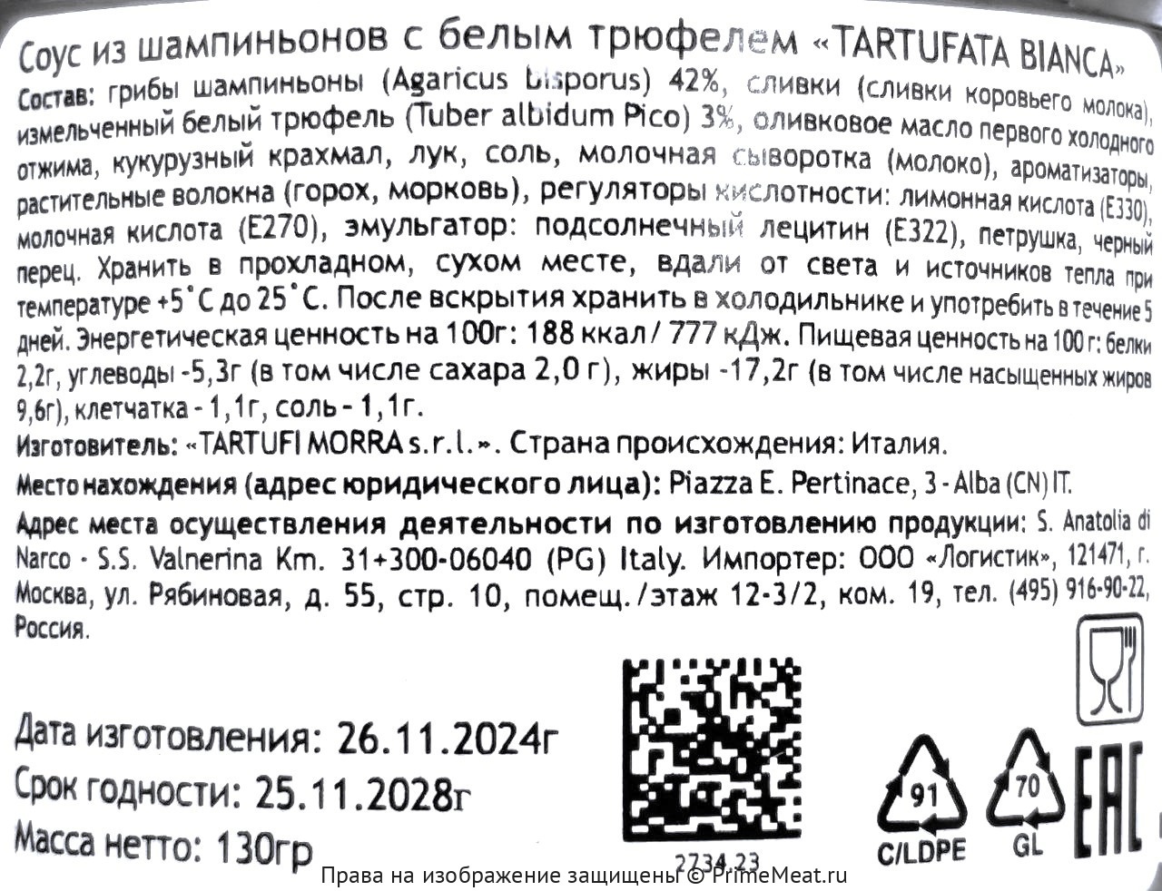 Состав: Шампиньоны (42%), сливки (коровьи сливки), измельченный белый трюфель (3%), оливковое масло первого холодного отжима, белое вино, кукурузный крахмал, лук, соль, сухая молочная сыворотка, ароматизаторы, петрушка, растительная клетчатка (горох, морковь), регулятор кислотности: лимонная кислота, эмульгатор: подсолнечный лецитин, черный перец.
